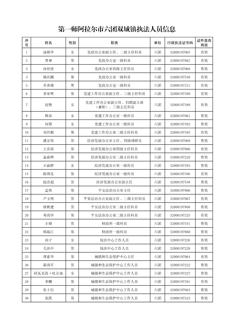 第一師阿拉爾市六團雙城鎮行政執法人員信息公示表