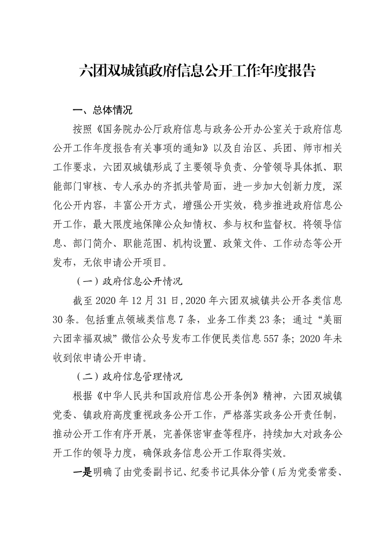 第一師阿拉爾市六團(tuán)雙城鎮(zhèn)2020年政府信息公開工作年度報(bào)告