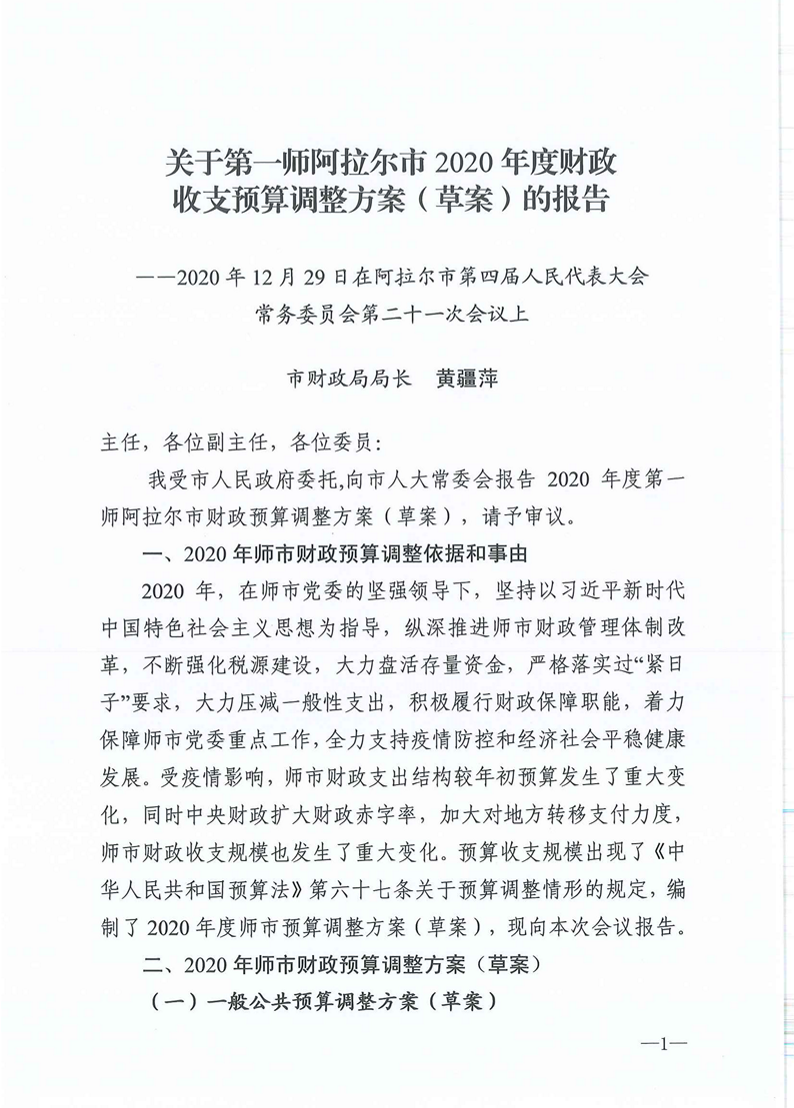 2020年12月29日,阿拉爾市第四屆人民代表大會常務委員會第二十一次會議審查批準了《關于第一師阿拉爾市2020年度財政收支預算調整方案(草案)的報告》,根據《預算法》相關規定和《兵團貫徹<關于進一步推進預算公開工作的意見>的實施意見》(新兵黨辦發〔2016〕56號)文件要求,現予公開。