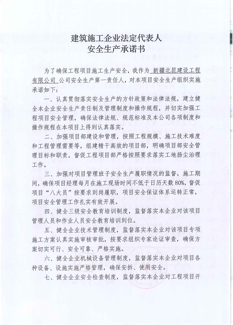 建筑施工企業(yè)法定代表人安全生產(chǎn)承諾書-新疆北昆建設(shè)工程有限公司
