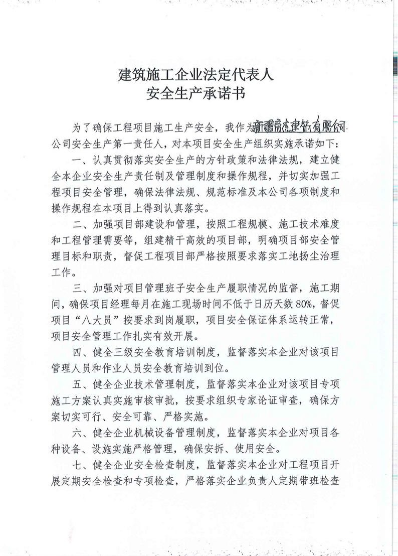 建筑施工企業法定代表人安全生產承諾書-新疆帝杰建筑有限公司