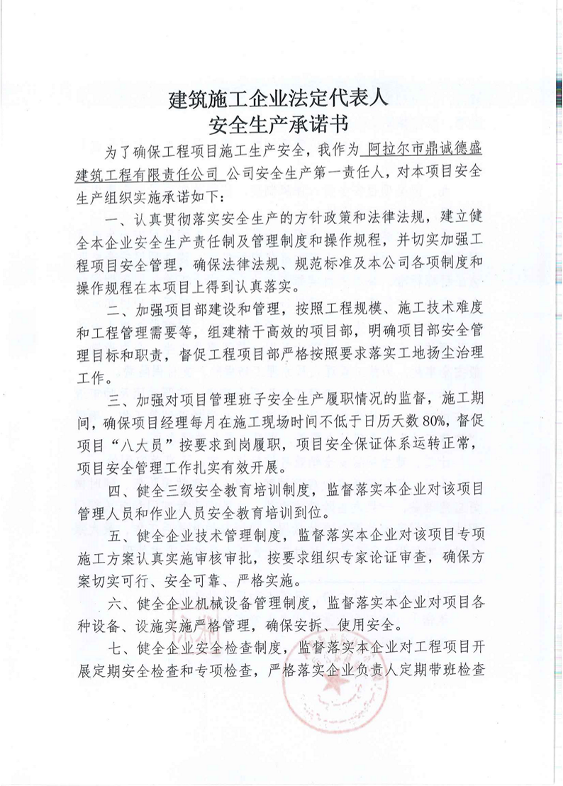 建筑施工企業法定代表人安全生產承諾書-阿拉爾鼎誠德盛建筑工程有限責任公司