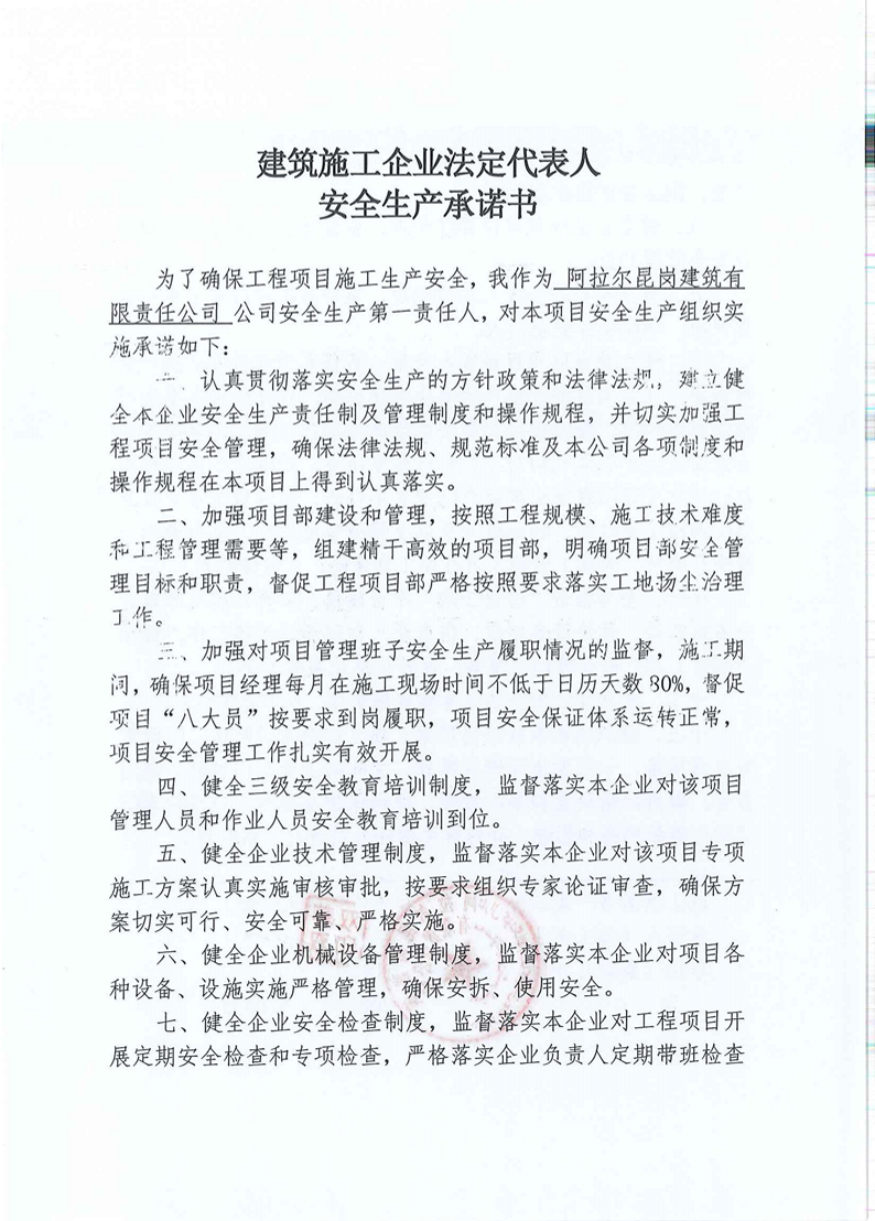 建筑施工企業法定代表人安全生產承諾書-阿拉爾昆崗建筑有限責任公司