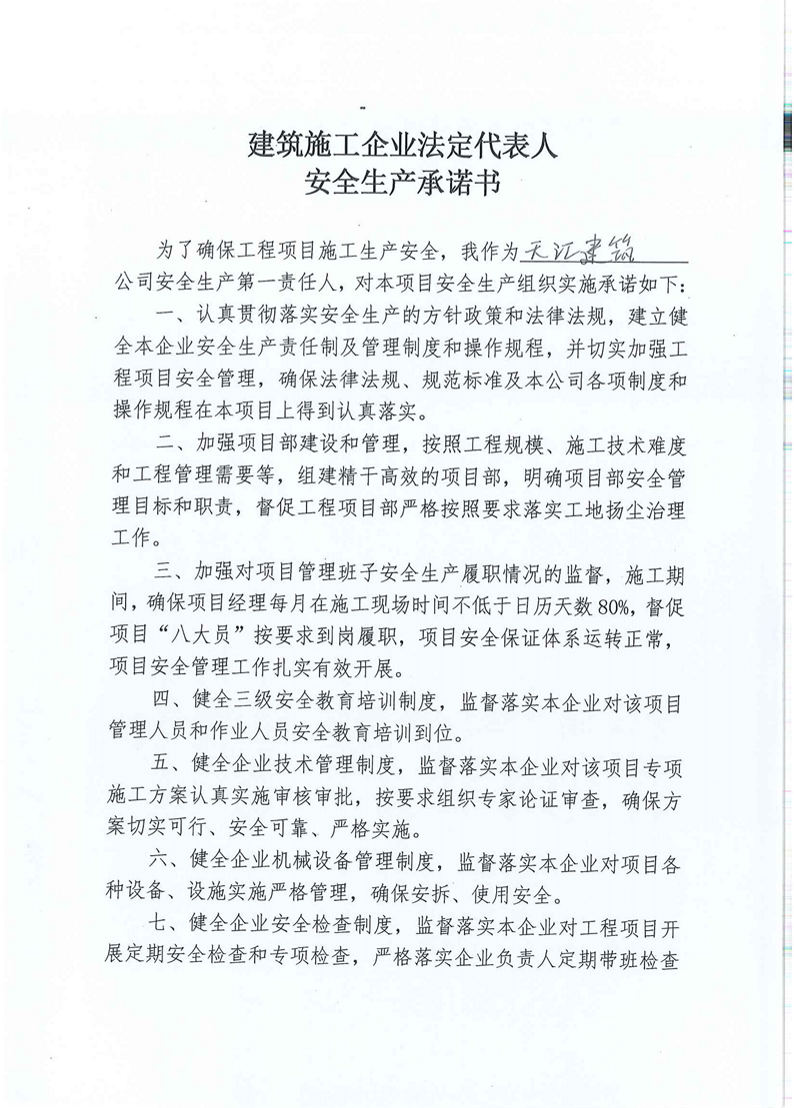 建筑施工企業(yè)法定代表人安全生產(chǎn)承諾書-阿拉爾天匯建筑有限公司