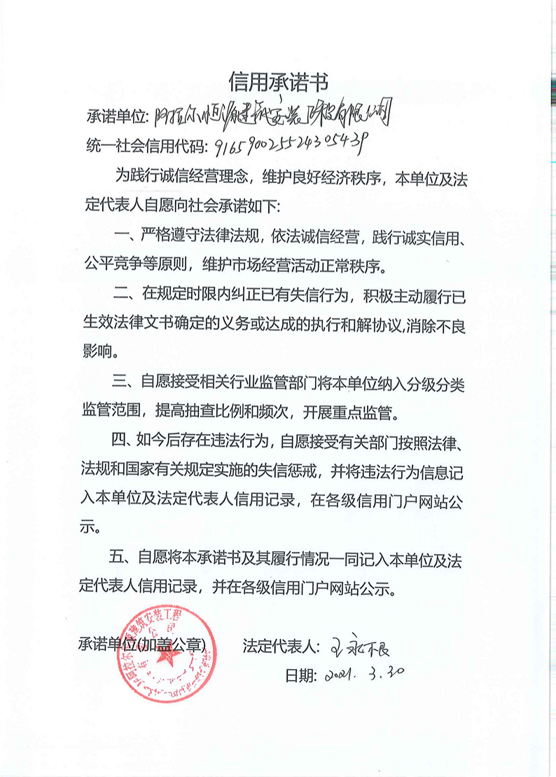 信用承諾書-阿拉爾恒源建筑安裝工程有限公司