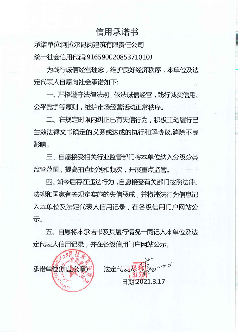 信用承諾書(shū)-阿拉爾昆崗建筑有限責(zé)任公司