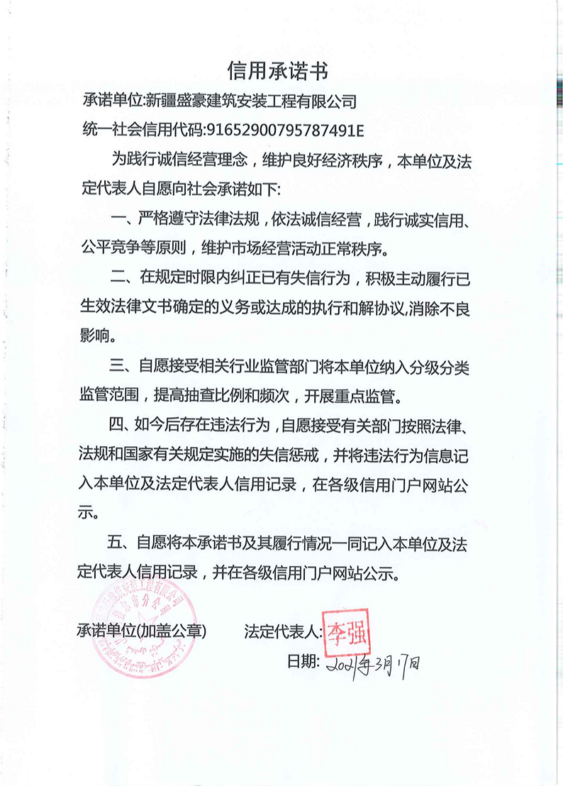 信用承諾書-新疆盛豪建筑安裝工程有限公司