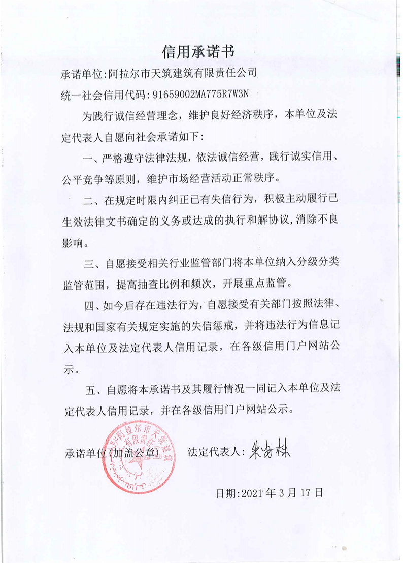 信用承諾書-阿拉爾市天筑建筑有限責任公司