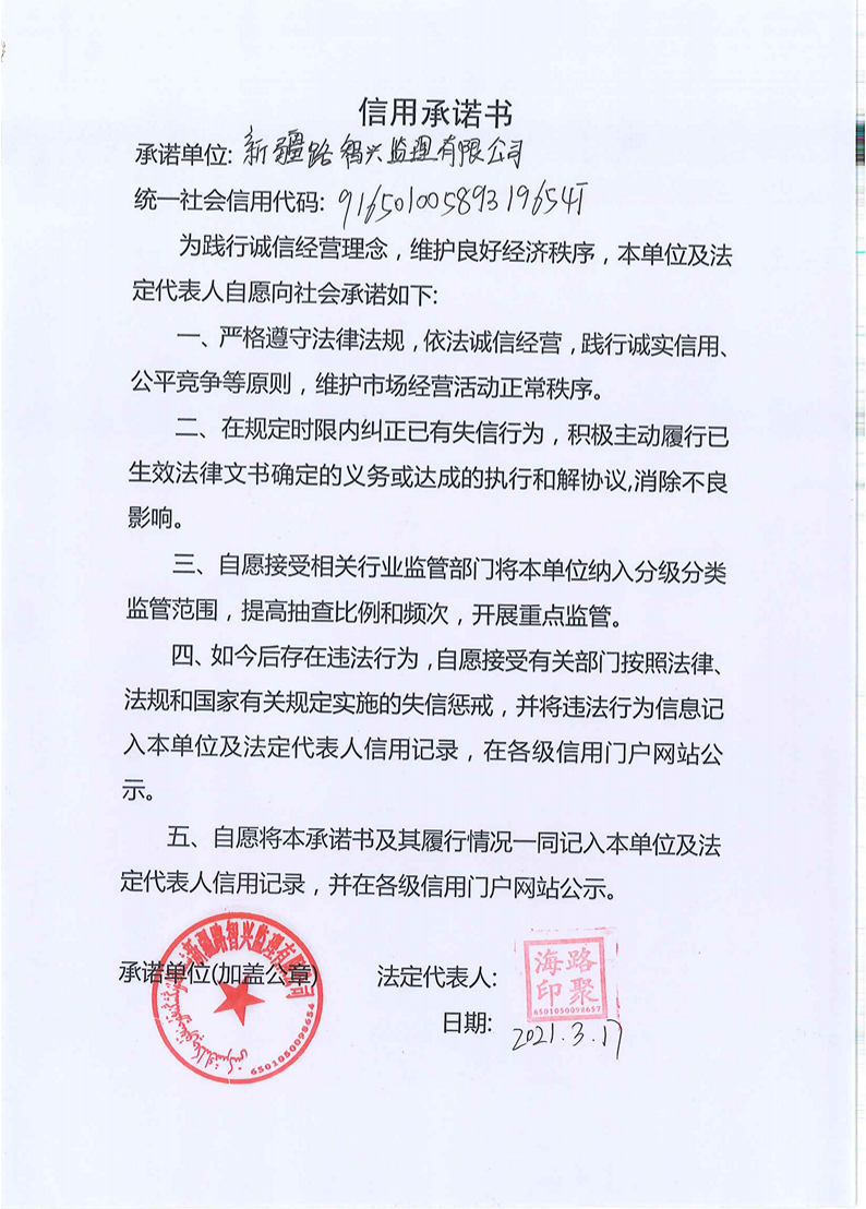 監(jiān)理單位信用承諾書-新疆路智興監(jiān)理有限公司