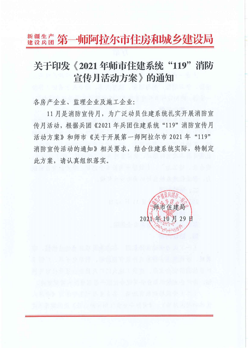 關(guān)于印發(fā)《2021年師市住建系統(tǒng)“119”消防宣傳月活動(dòng)方案》的通知