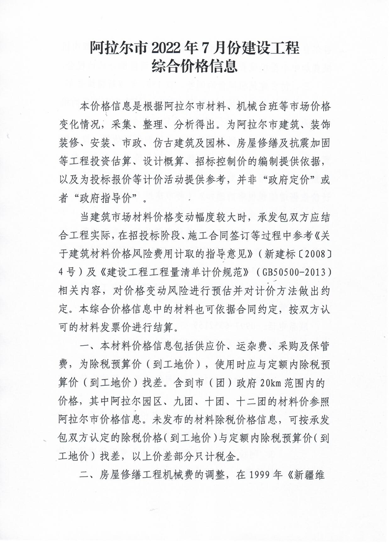 阿拉爾市2022年7月份建設工程綜合價格信息