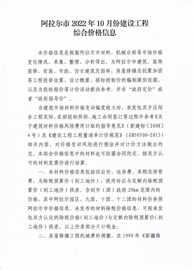 阿拉爾市2022年10月份建設工程綜合價格信息
