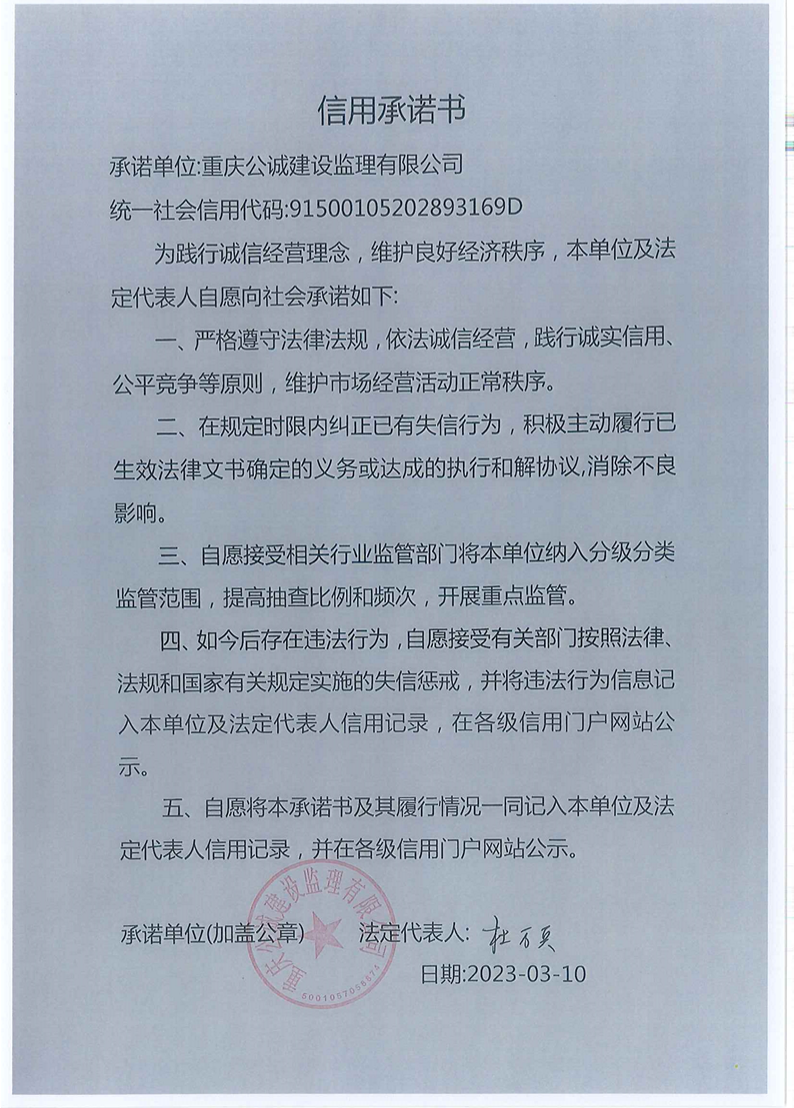 重慶公誠(chéng)監(jiān)理信用承諾書