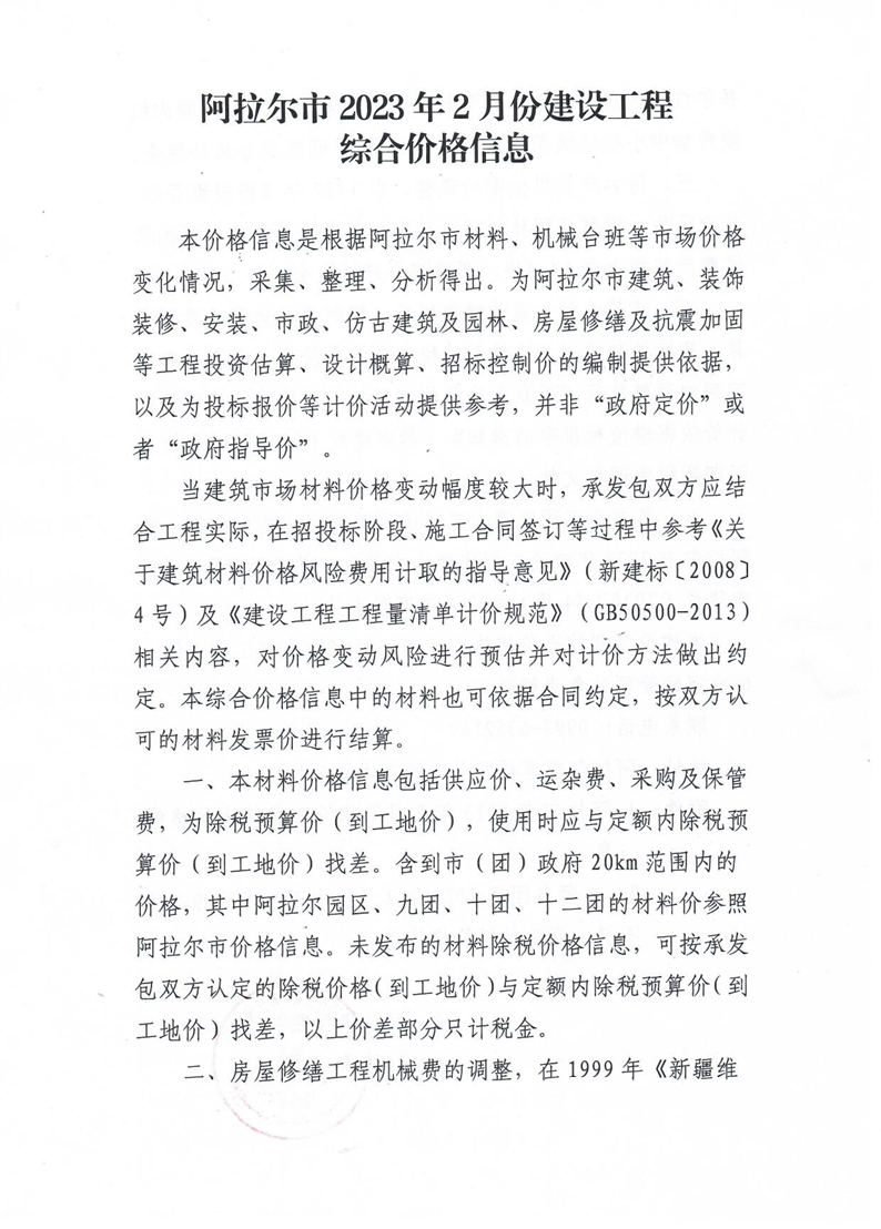 阿拉爾市2023年2月份建設工程綜合價格信息