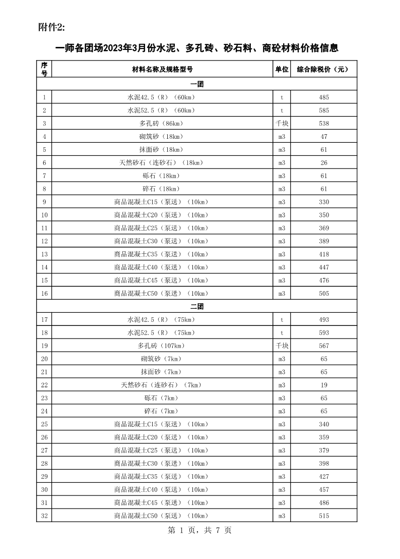 附件2:一師各團場2023年3月份水泥、多孔磚、砂石料、商砼材料價格信息
