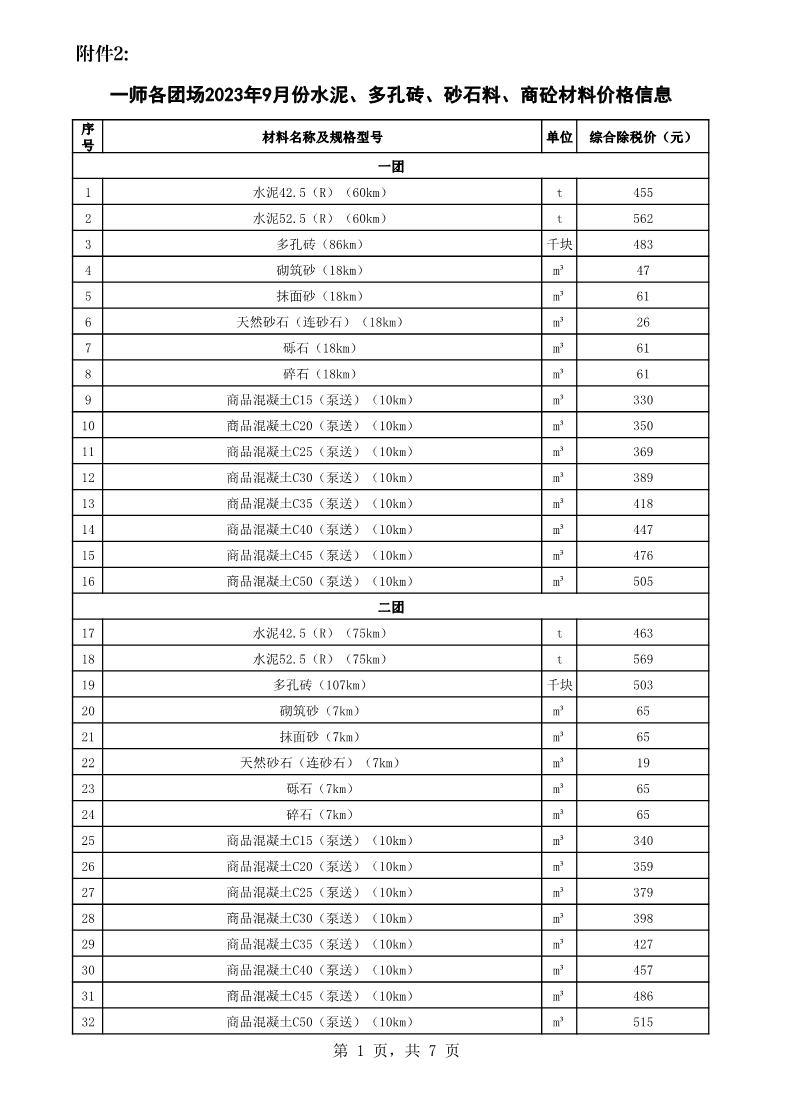 附件2:一師各團場2023年9月份水泥、多孔磚、砂石料、商砼材料價格信息