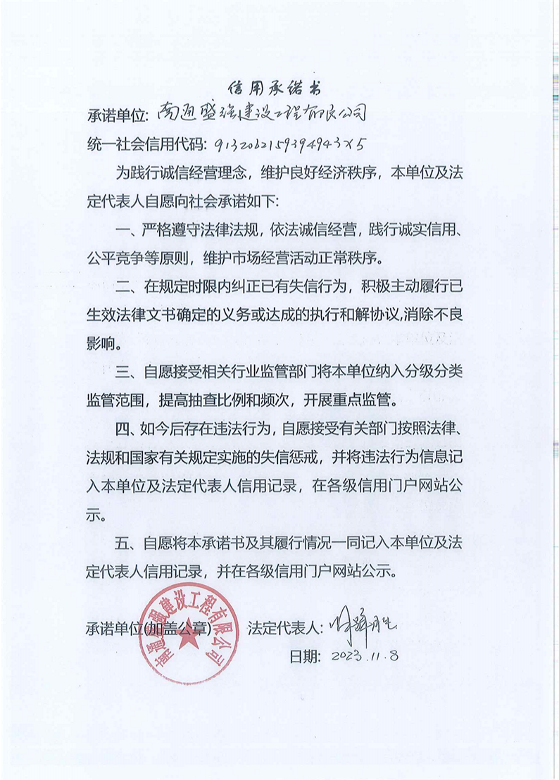 南通盛強信用承諾書