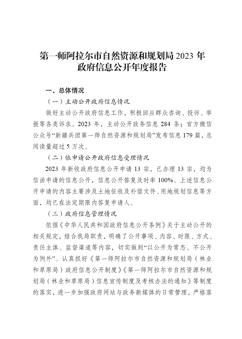 第一師阿拉爾市自然資源和規(guī)劃局2023年政府信息公開年度報告