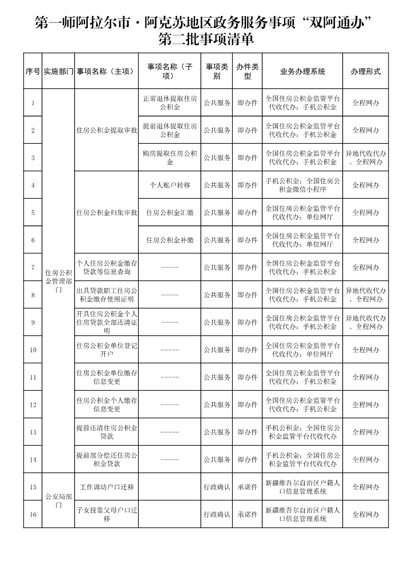 第一師阿拉爾市·阿克蘇地區政務 服務“雙阿通辦”第二批事項清單