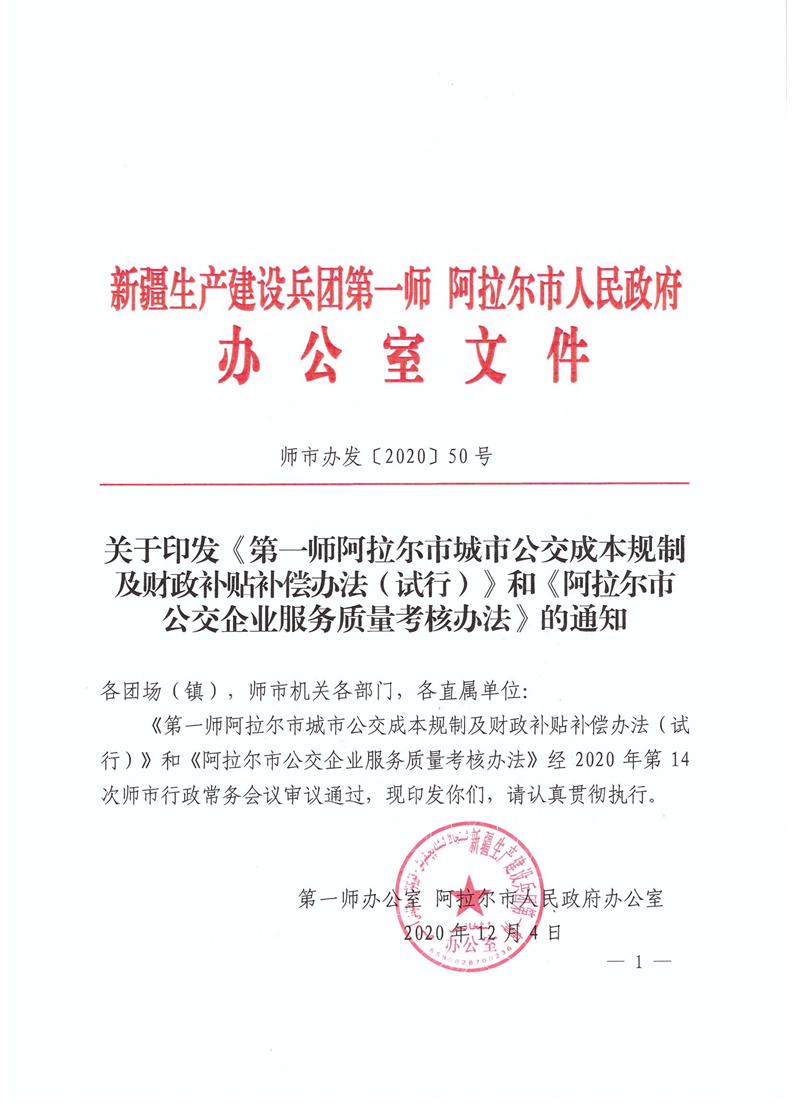 關于印發《第一師阿拉爾市城市公交成本規制及財政補貼補償辦法(試行)》和《阿拉爾市公交企業服務質量考核辦法》的通知