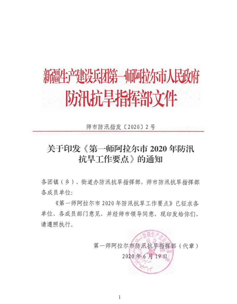 關于印發《第一師阿拉爾市2020年防汛抗旱工作要點》的通知