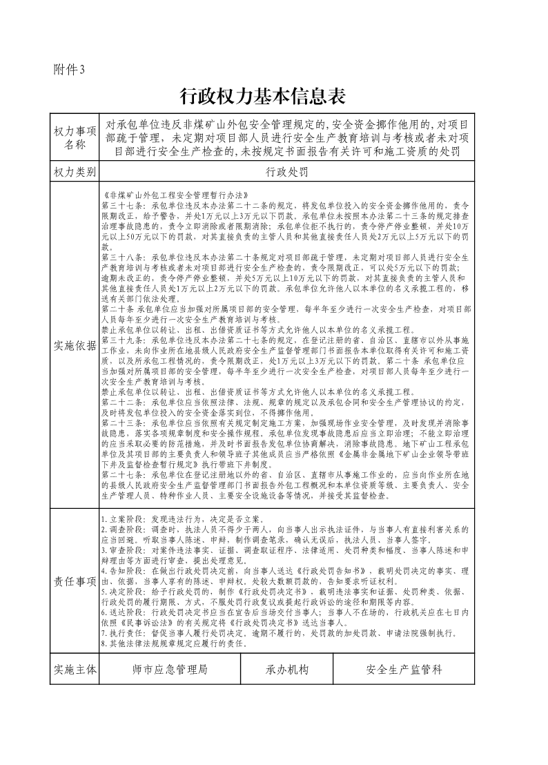 對承包單位違反非煤礦山外包安全管理規定的,安全資金挪作他用的,對項目部疏于管理,未定期對項目部人員進行安全生產教育培訓與考核或者未對項目部進行安全生產檢查的,未按規定書面報告有關許可和施工資質的處罰
