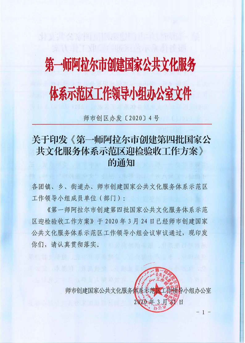 《第一師阿拉爾市創建第四批國家公共文化服務體系示范區迎檢驗收工作方案》