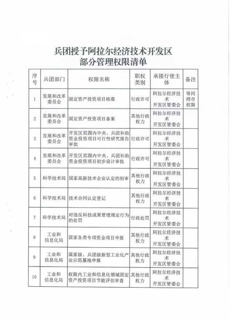兵團授予阿拉爾經濟技術開發區部分管理權限清單