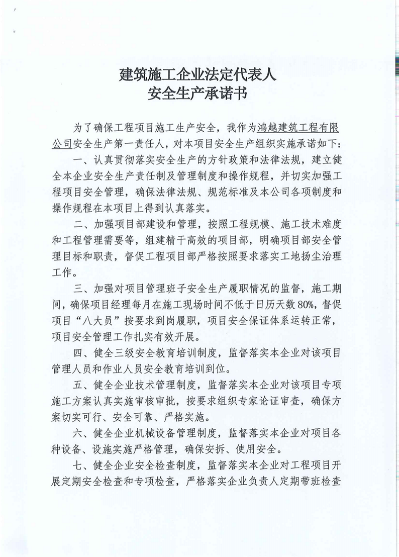 建筑施工企業法定代表人安全生產承諾書-鴻越建筑工程有限公司