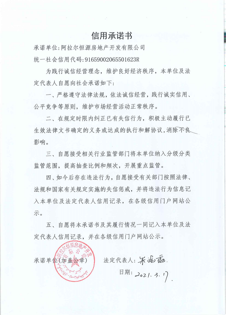 建設(shè)單位信用承諾書-阿拉爾恒源房地產(chǎn)開發(fā)有限公司
