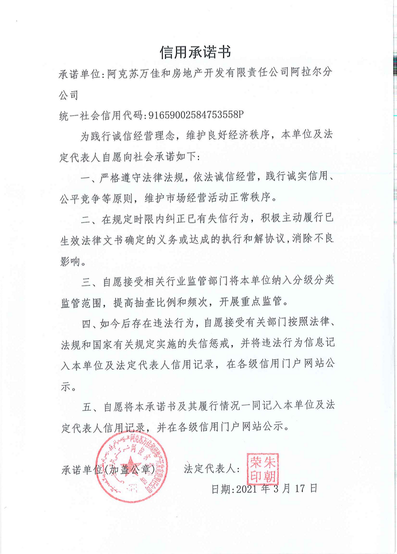 建設單位信用承諾書-阿克蘇萬佳和房地產開發有限責任公司阿拉爾分公司