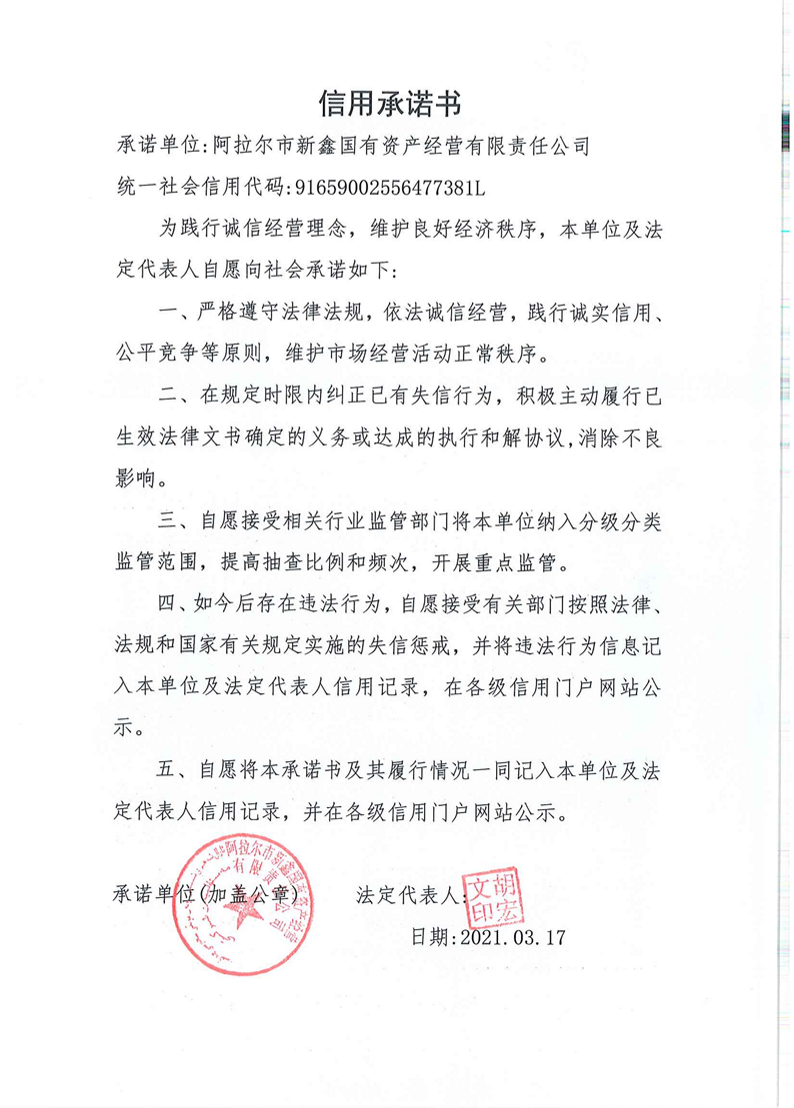 建設單位信用承諾書-阿拉爾市新鑫國有資產經營有限責任公司
