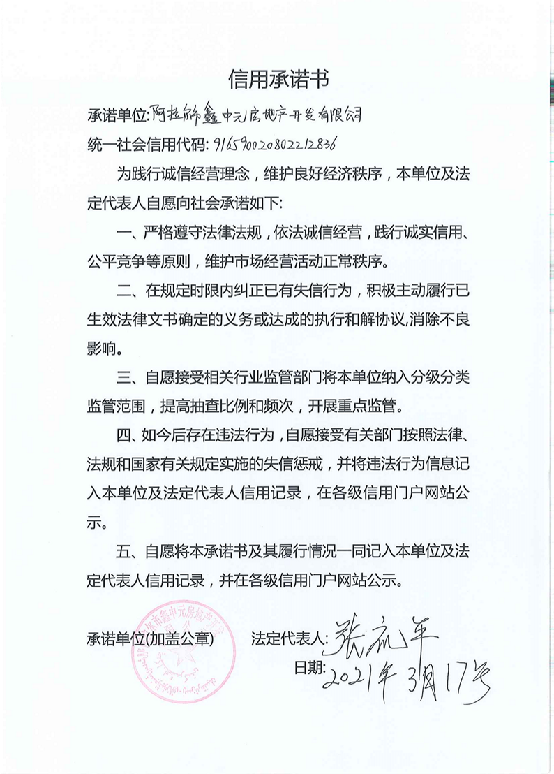 建設(shè)單位信用承諾書-阿拉爾市鑫中元房地產(chǎn)開發(fā)有限公司