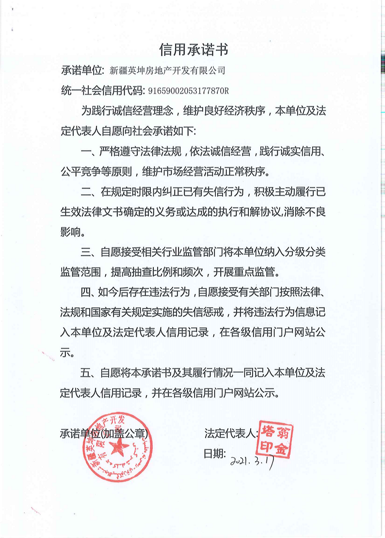 建設(shè)單位信用承諾書-新疆英坤房地產(chǎn)開發(fā)有限公司