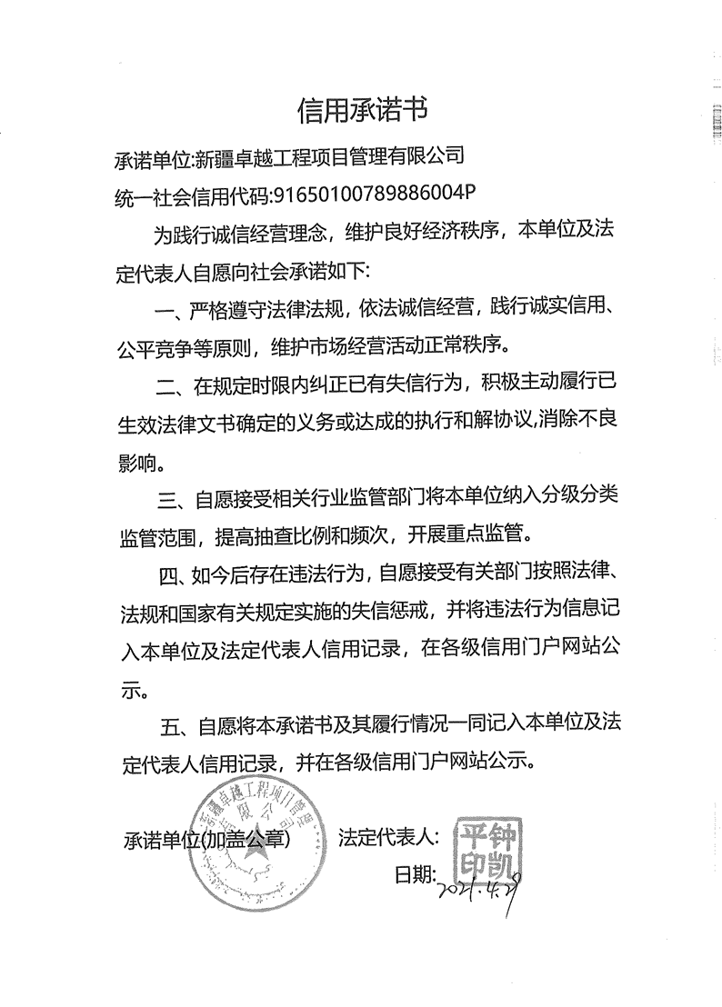 監理單位信用承諾書-新疆卓越工程項目管理有限公司