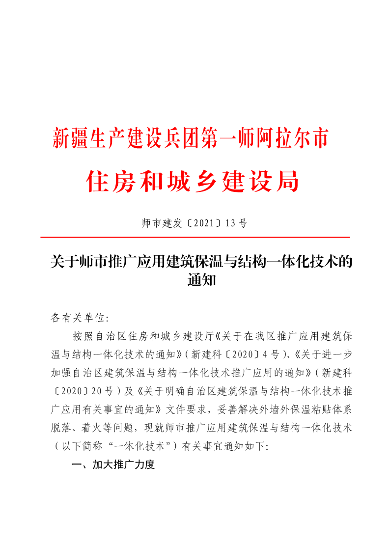 關于師市推廣應用建筑保溫與結構一體化技術的通知
