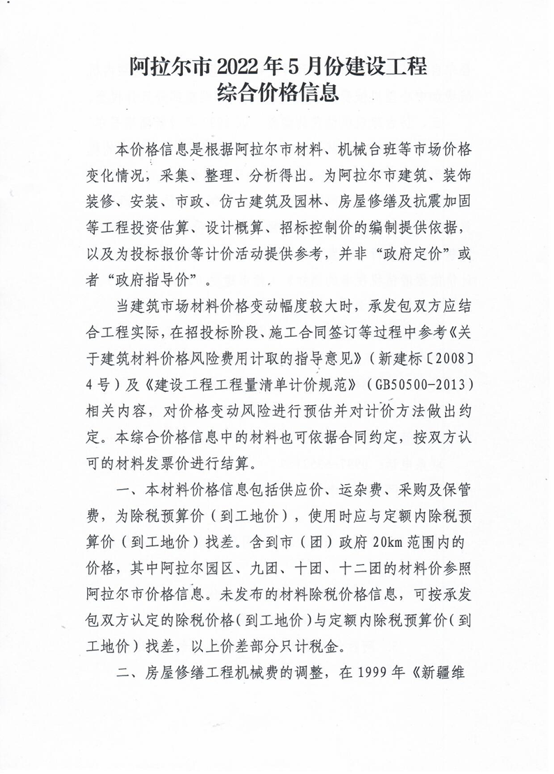阿拉爾市2022年5月份建設工程綜合價格信息