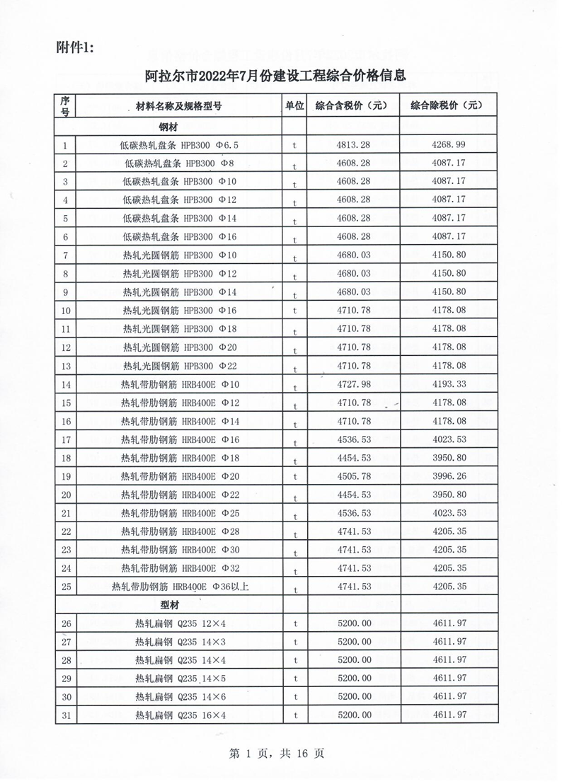附件1:阿拉爾市2022年7月份建設(shè)工程價(jià)格信息