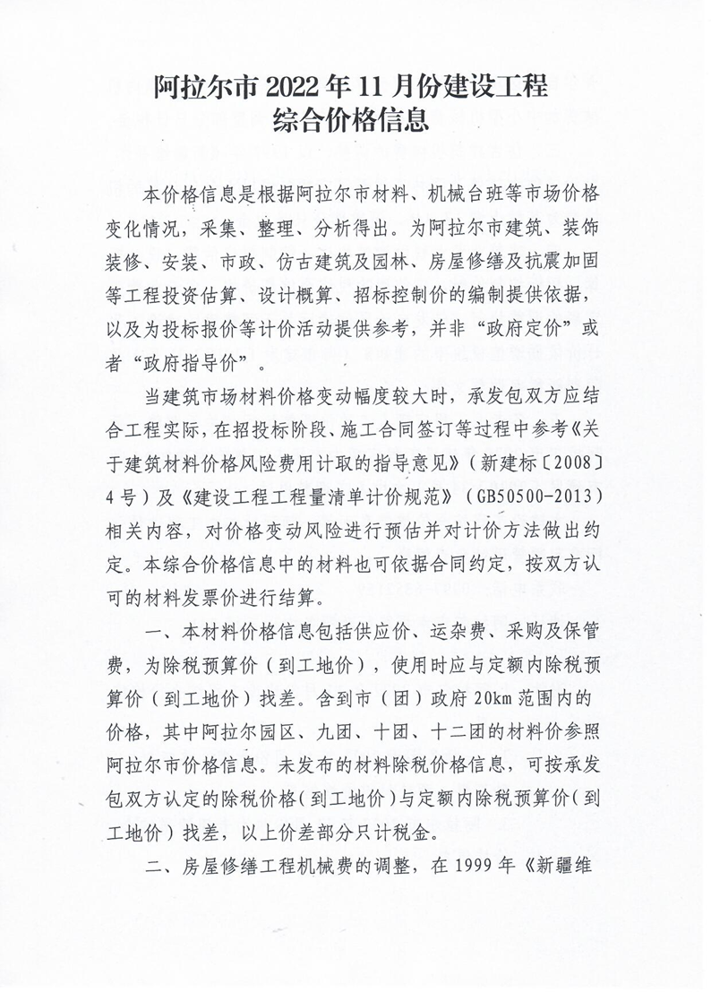 阿拉爾市2022年11月份建設工程綜合價格信息