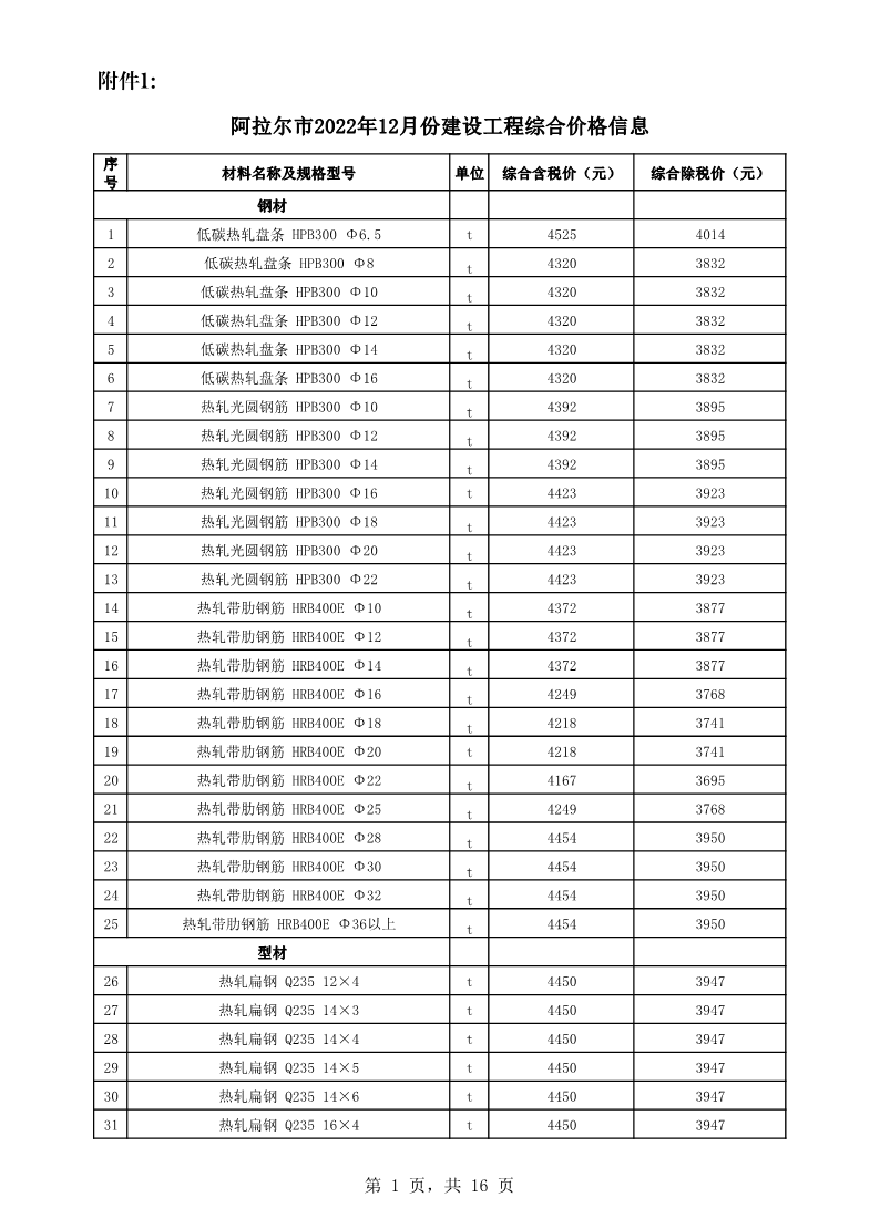 附件1:阿拉爾市2022年12月份建設工程價格信息