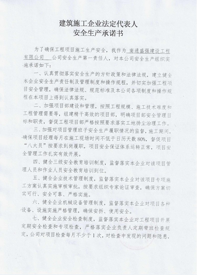 南通盛強安全生產承諾書