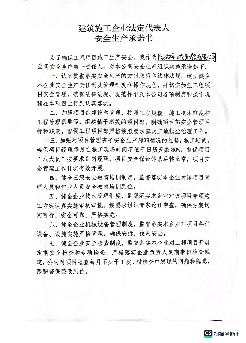 城景建司安全生產(chǎn)承諾書