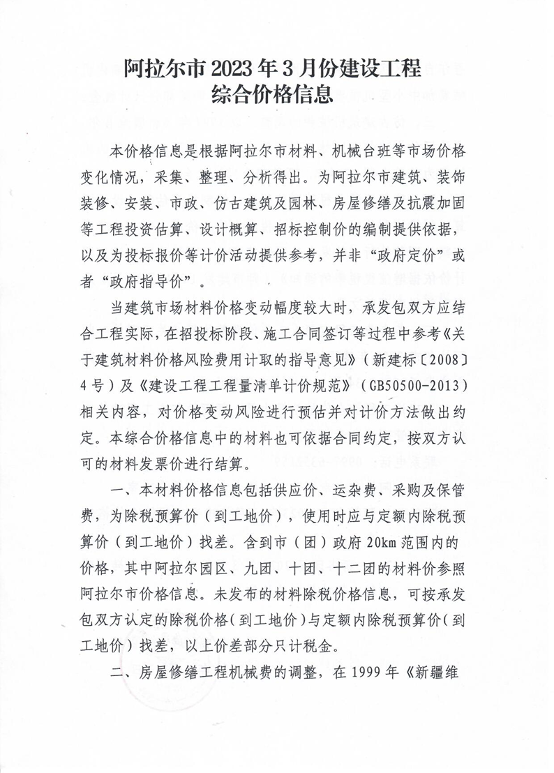 阿拉爾市2023年3月份建設工程綜合價格信息