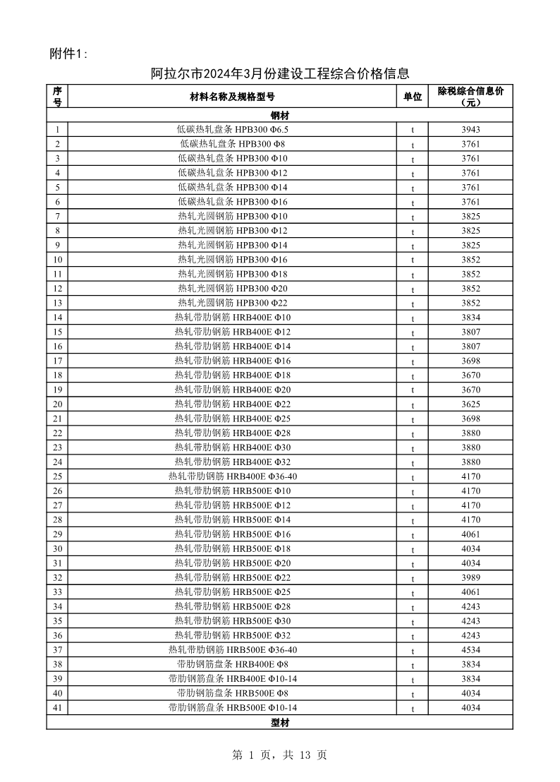 附件1:阿拉爾市2024年3月份建設工程價格信息