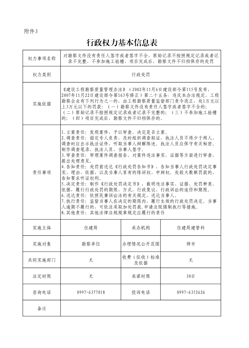 對勘察文件沒有責任人簽字或者簽字不全、原始記錄不按照規定記錄或者記錄不完整、不參加施工驗槽、項目完成后,勘察文件不歸檔保存的處罰