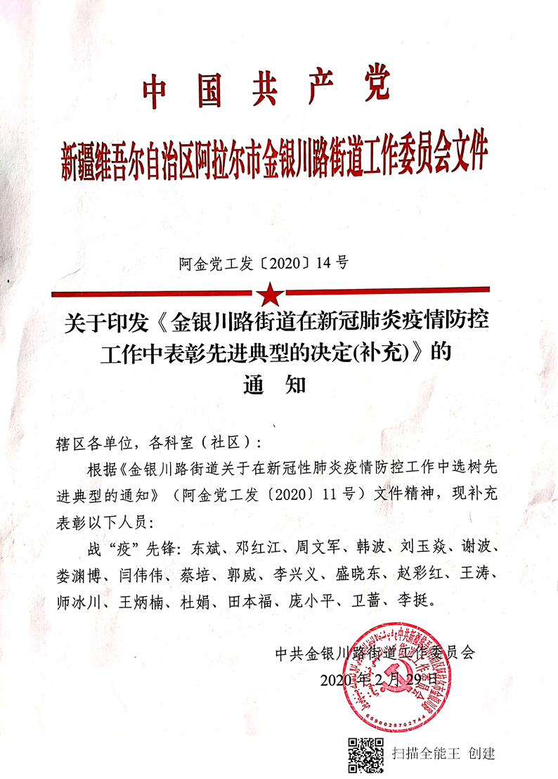 關于印發金銀川路街道在新冠肺炎疫情防控工作中表彰先進典型的決定(補充)的通知