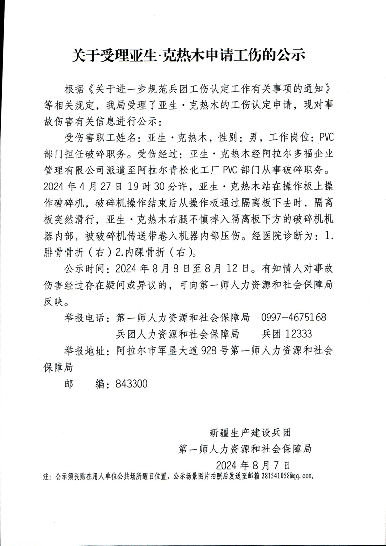 關于受理亞生·克熱木等15人申請工傷的公示