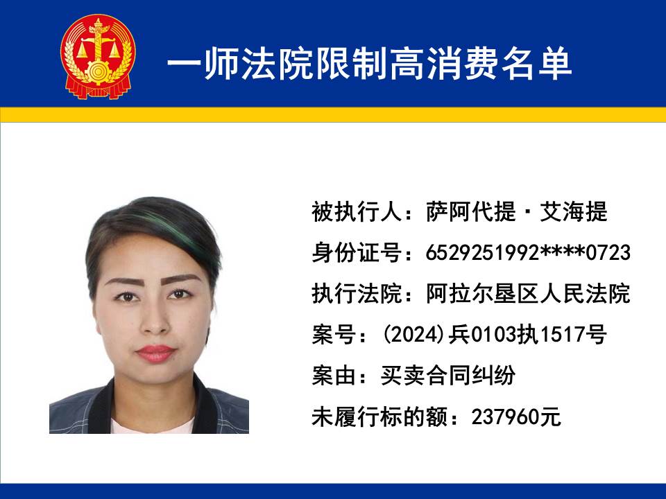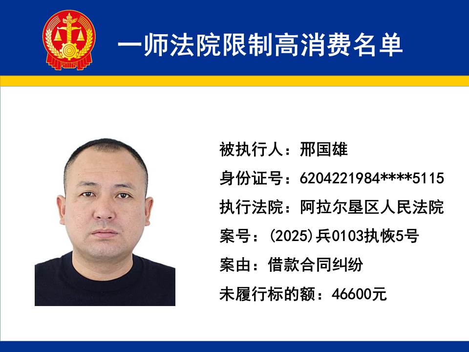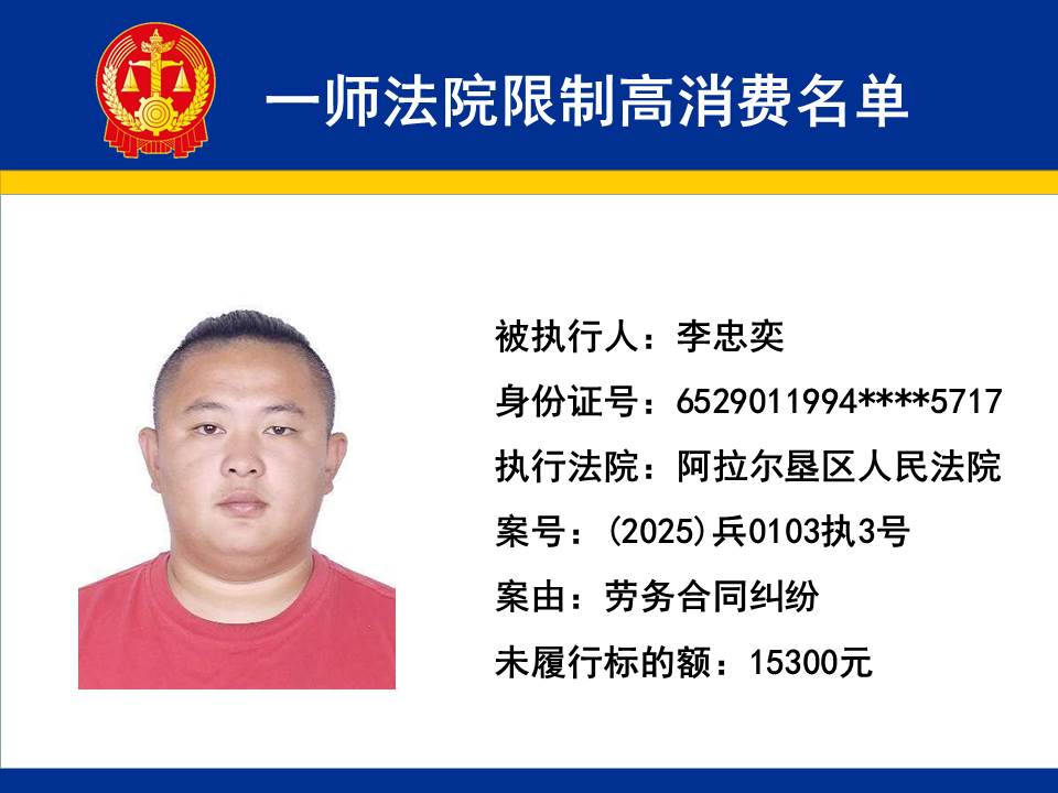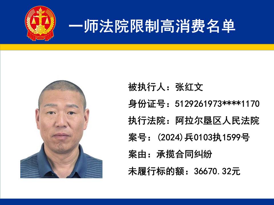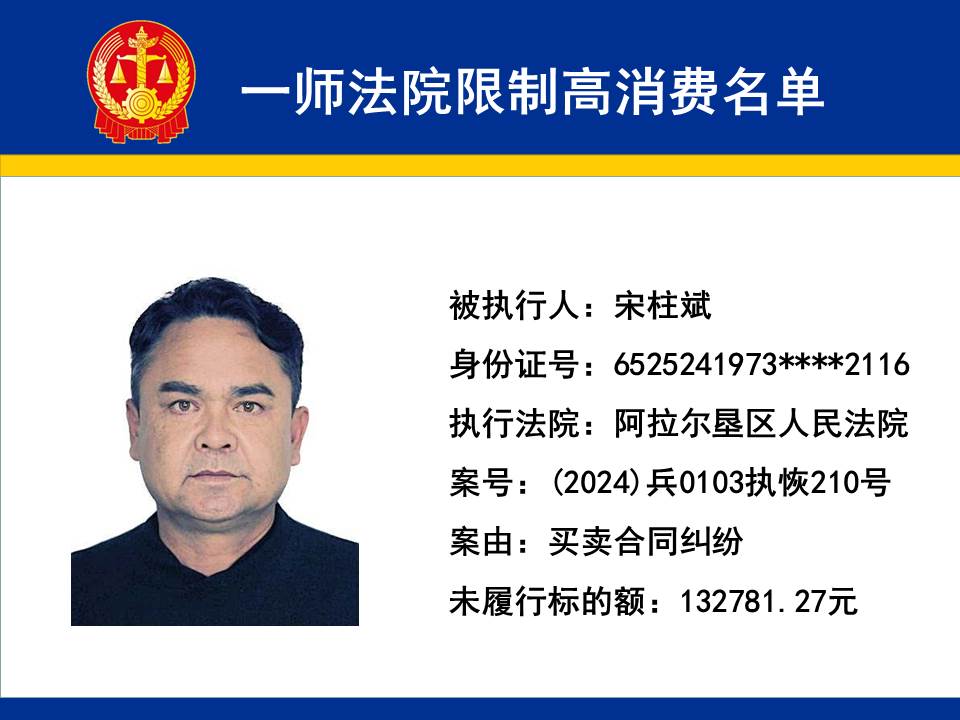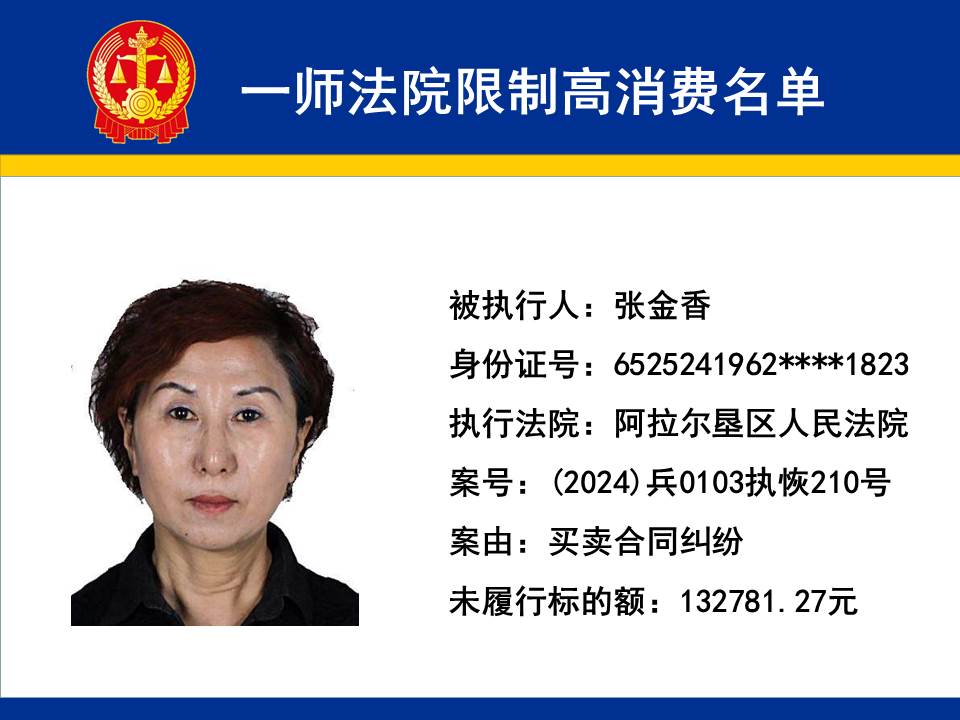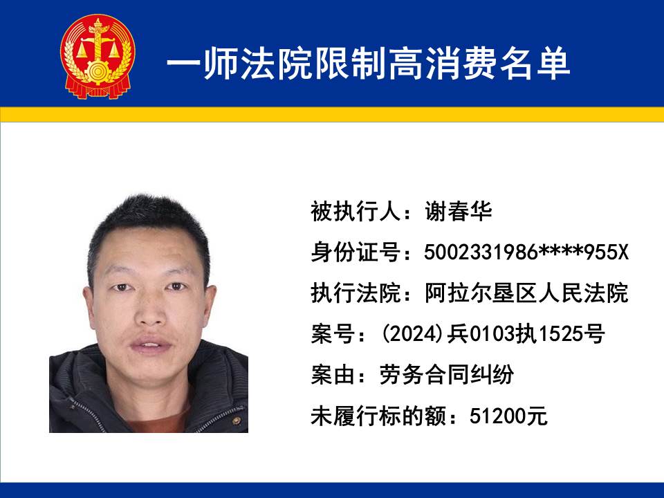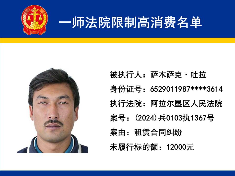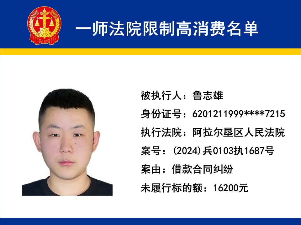 為切實保障申請執行人的合法權益,維護司法權威,依據《最高人民法院關于限制被執行人高消費及有關消費的若干規定》第一條、第六條、第七條之規定,第一師中級人民法院對不履行生效法律文書的下列被執行人依法發出限制高消費令,促使被執行人自覺履行法律文書確定的義務,現將以下限制高消費被執行人名單予以公布曝光: