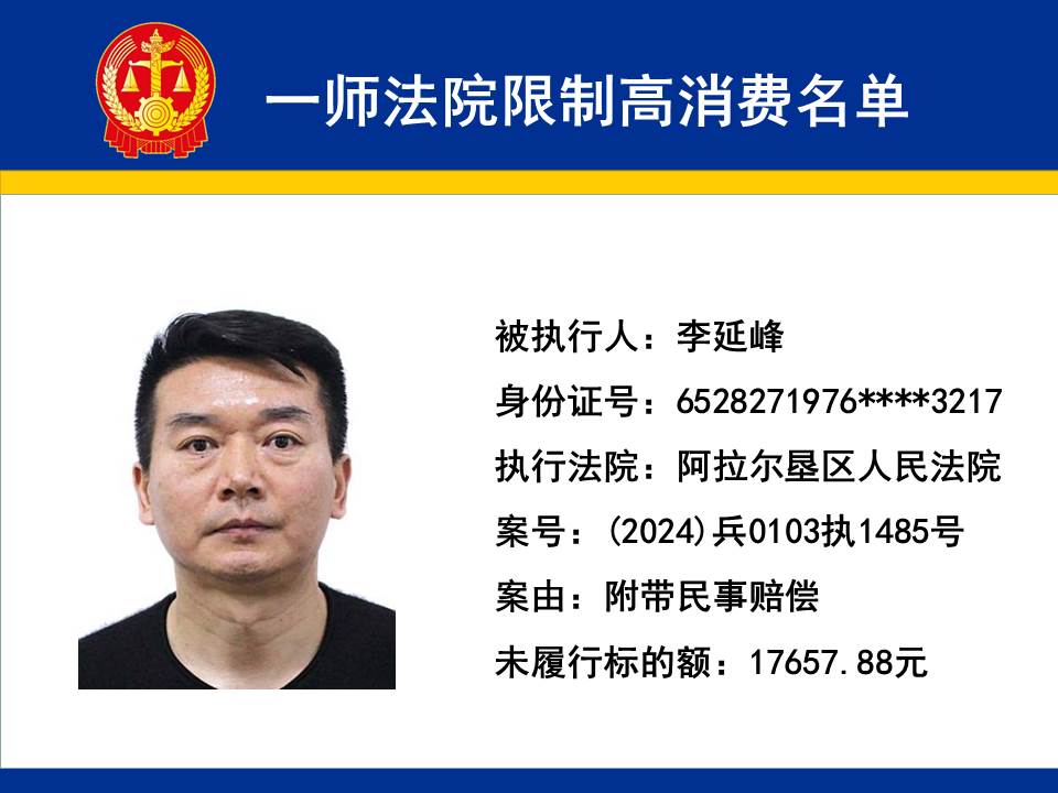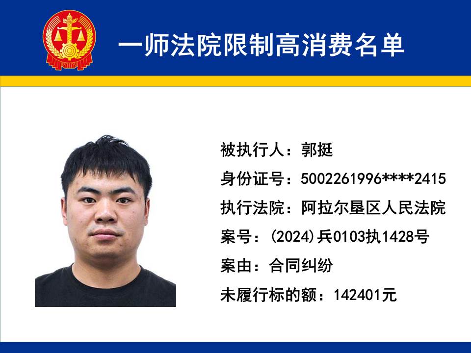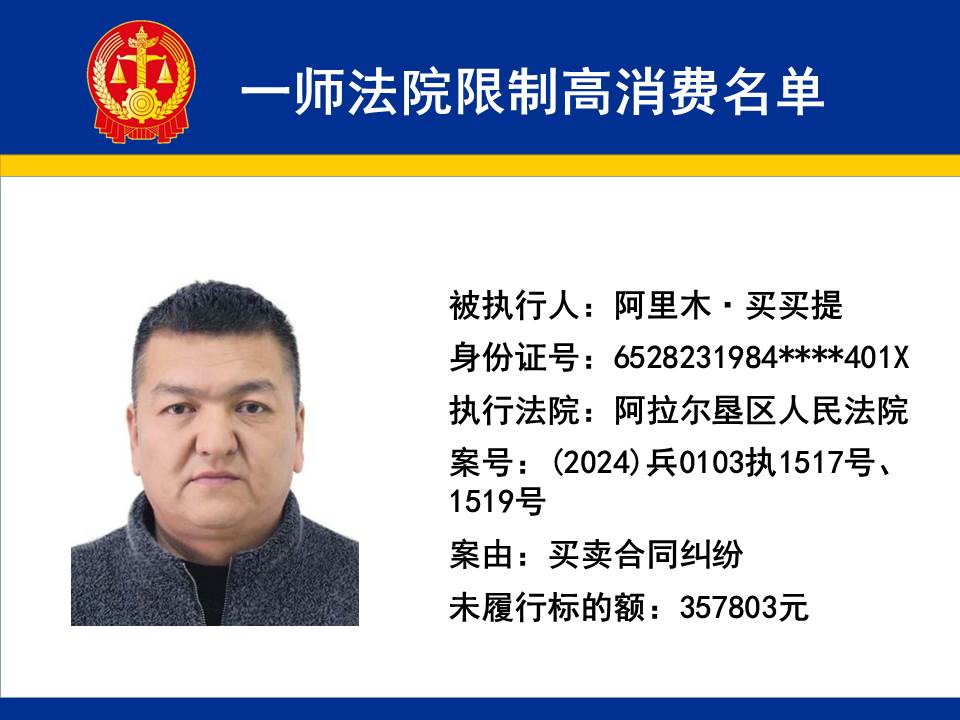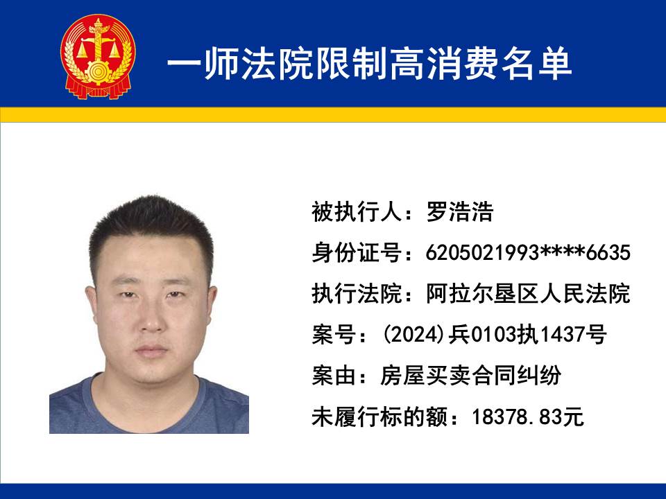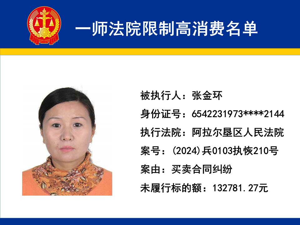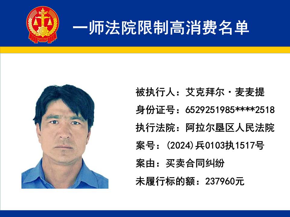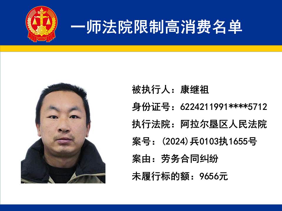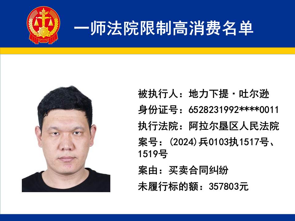 為切實保障申請執行人的合法權益,維護司法權威,依據《最高人民法院關于限制被執行人高消費及有關消費的若干規定》第一條、第六條、第七條之規定,第一師中級人民法院對不履行生效法律文書的下列被執行人依法發出限制高消費令,促使被執行人自覺履行法律文書確定的義務,現將以下限制高消費被執行人名單予以公布曝光: