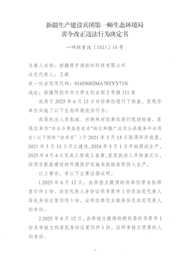 紡織科技有限公司《責令改正違法行為決定書》16號的公示